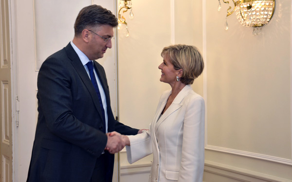 Predsjednik Vlade Andrej Plenković primio je u Banskim dvorima Julie Isabel Bishop, prvu australsku ministricu vanjskih poslova koja je posjetila Hrvatsku