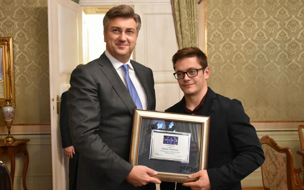 Premijer Plenković primio je osvajača zlatne medalje na Svjetskom prvenstvu u gimnastici u Montrealu Tina Srbića i izaslanstvo Hrvatskoga gimnastičkoga saveza, na čelu s predsjednikom Stevom Tkalčecom