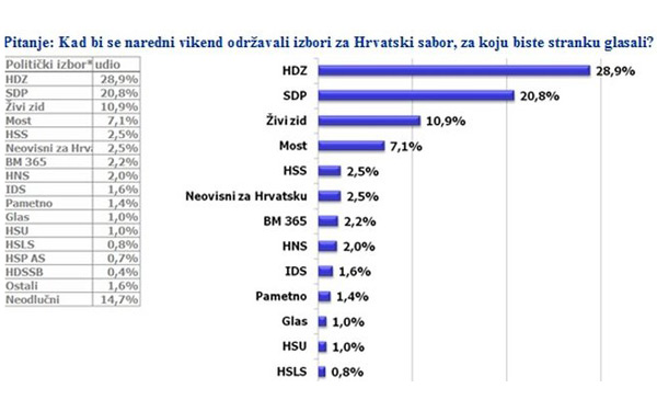 Prema redovitom istraživanju CRO Demoskop HDZ u ožujku bilježi potporu od 28,9 posto, dok SDP-ov rejting iznosi 20,8 posto