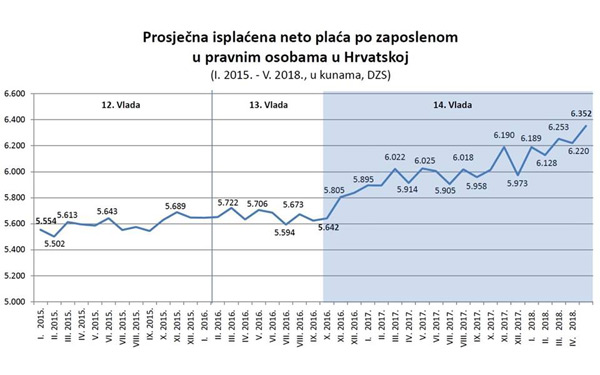 U pogledu na razdoblje od siječnja do svibnja ove godine prosječna mjesečna isplaćena neto plaća po zaposlenom u pravnim osobama u Hrvatskoj iznosila je 6.229 kuna, što je u odnosu na isto razdoblje 2017. realno povećanje od 3,5 posto.