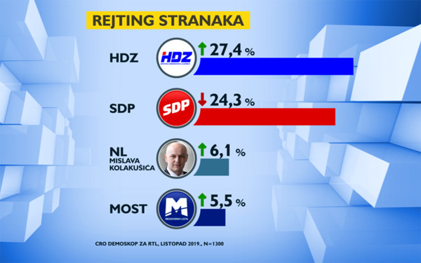 Prema istraživanju CRO Demoskop na vrhu ljestvice preferencija političkih stranaka nalazi se HDZ s izborom od 27,4 posto ispitanika (prema 27 posto iz rujna). SDP je drugi i bilježi potporu od 24,3 posto (prema 24,4 posto iz rujna), a slijede Nezavisna lista Mislava Kolakušića s izborom od 6,1 posto i MOST sa 5,5 posto te ostale stranke. Neodlučnih birača je 11 posto.