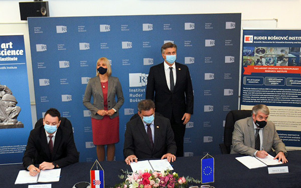 Predsjednik Vlade Andrej Plenković sudjelovao je u svečanom potpisivanju ugovora o dodjeli bespovratnih europskih sredstava za projekt Otvorene znanstvene infrastrukturne platforme za inovativne primjene u gospodarstvu i društvu na Institutu Ruđer Bošković