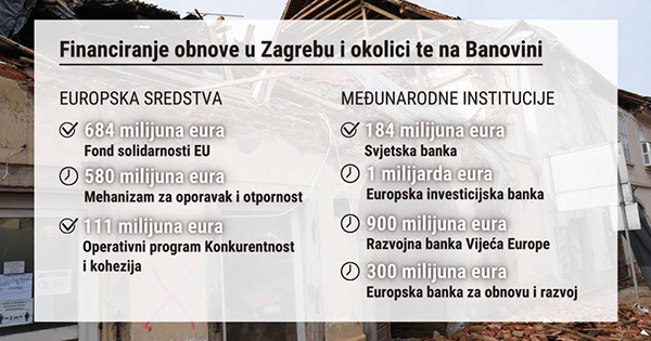 Europska sredstva uključuju 684 milijuna eura iz Fonda solidarnosti za obnovu Zagreba, planiramo skoro 600 milijuna eura iz Mehanizma za oporavak i otpornost, dakle iz Instrumenta EU iduće generacije, a iz postojećeg Višegodišnjeg financijskog okvira iz Operativnog programa za Konkurentnost i koheziju realocirano je 111 milijuna eura.