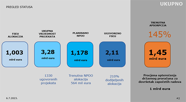 "S današnjim danom iskorišteno je 1,45 milijardi eura, odnosno ukupno smo prešli predviđeni alocirani iznos za 45%", nastavio je ministar.