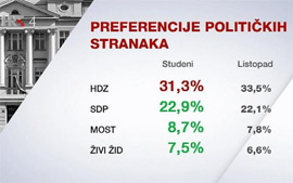 Prema redovitom istraživanju CRO Demoskop HDZ u studenome bilježi potporu od 31,3 posto, dok SDP-ov rejting iznosi 22,9 posto. Čak 69,8 posto ispitanika smatra zbivanja u vezi s Agrokorom dominantnom temom.