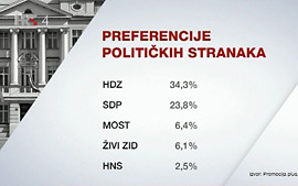 Istraživanje CRO Demoskop u srpnju pokazuje da je potpora HDZ-u porasla na 34,3%, dok je SDP na 23,8%. Premijer Plenković najpozitivniji je političar s izborom od 18,8% ispitanika, a podrška radu Vlade također je porasla na 42,4%.