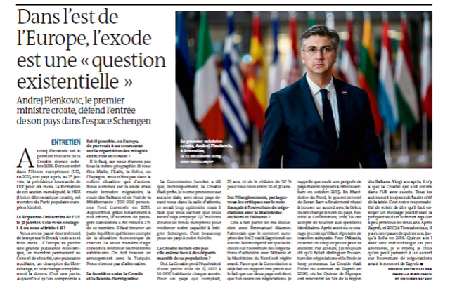 Zbog migracije iz istočnih u zapadne zemlje polovica članica Unije suočena je s demografskim gubicima i tim se izazovom treba baviti na europskoj razini, izjavio je hrvatski premijer Andrej Plenković za francuski list Le Monde