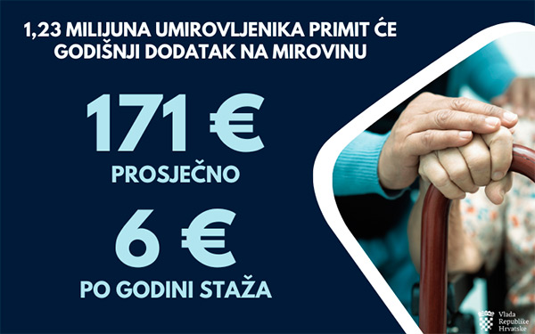 Godišnji dodatak za svih 1,23 milijuna umirovljenika u 2025. iznosit će 6 eura po godini staža, što znači da će prosječni isplaćeni dodatak iznositi 171 euro, objavio je predsjednik Vlade Andrej Plenković na platformi X