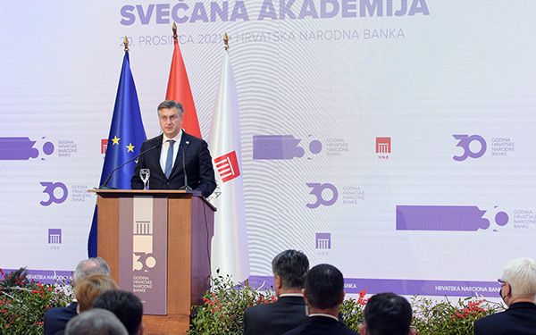 Premijer Andrej Plenković istaknuo je da 30. obljetnica Hrvatske narodne banke dolazi u zahtjevnim okolnostima pandemije i njezinih posljedica za gospodarstvo, ali i u važnom trenutku ubrzane integracije u europodručje