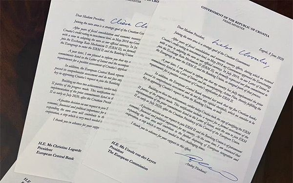 Predsjednik Vlade Andrej Plenković uputio je pismo predsjednicima vlada država članica europodručja i predsjednici Europske komisije kojim želi pridobiti njihovu potporu za ulazak Hrvatske u Europski tečajni mehanizam II