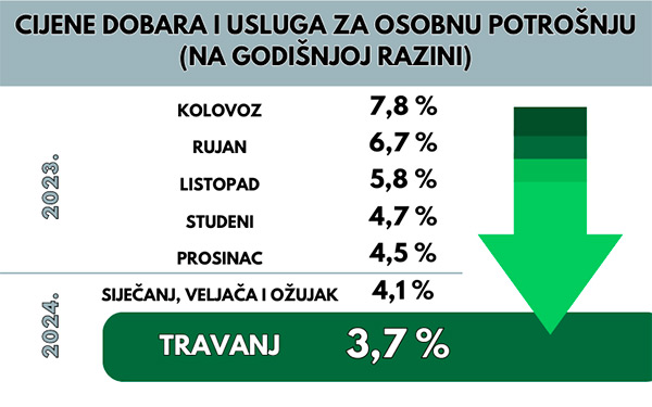 Prema prvim procjenama Državnog zavoda za statistiku stopa inflacije prema indeksu potrošačkih cijena iznosila je u travnju 3,7% na godišnjoj razini, tj. bila je niža nego u ožujku, kad je iznosila 4,1%