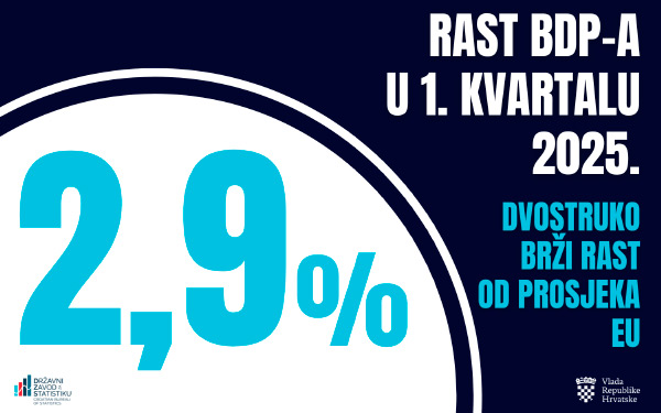 Prema procjeni Državnog zavoda za statistiku bruto je domaći proizvod u prvom tromjesečju 2025. realno porastao 2,9% u odnosu na isto razdoblje prošle godine