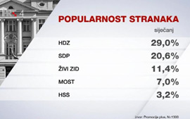 Prema redovitom istraživanju CRO Demoskop HDZ u siječnju bilježi potporu od 29 posto, dok SDP-ov rejting iznosi 20,6 posto, a u blagom su porastu potpora radu Vlade i društveni optimizam