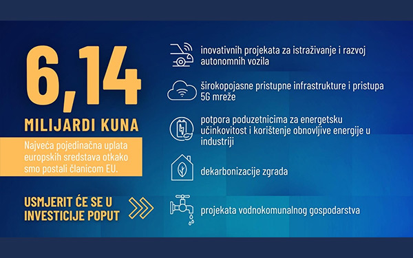 Europska komisija isplatila je Hrvatskoj predujam iz Mehanizma oporavka i otpornosti u iznosu od 818,4 milijuna eura, što je najviša pojedinačna uplata otkako je Hrvatska postala članica Europske unije