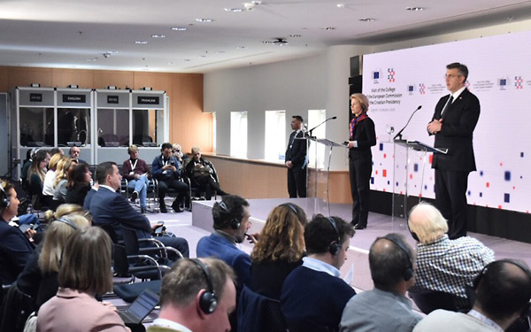 Nakon sastanka kolegija Europske komisije i hrvatske vlade, kojom je i formalno započelo hrvatsko predsjedanje EU-om, premijer Plenković i predsjednica Europske komisije Ursula von der Leyen dali su izjave za medije